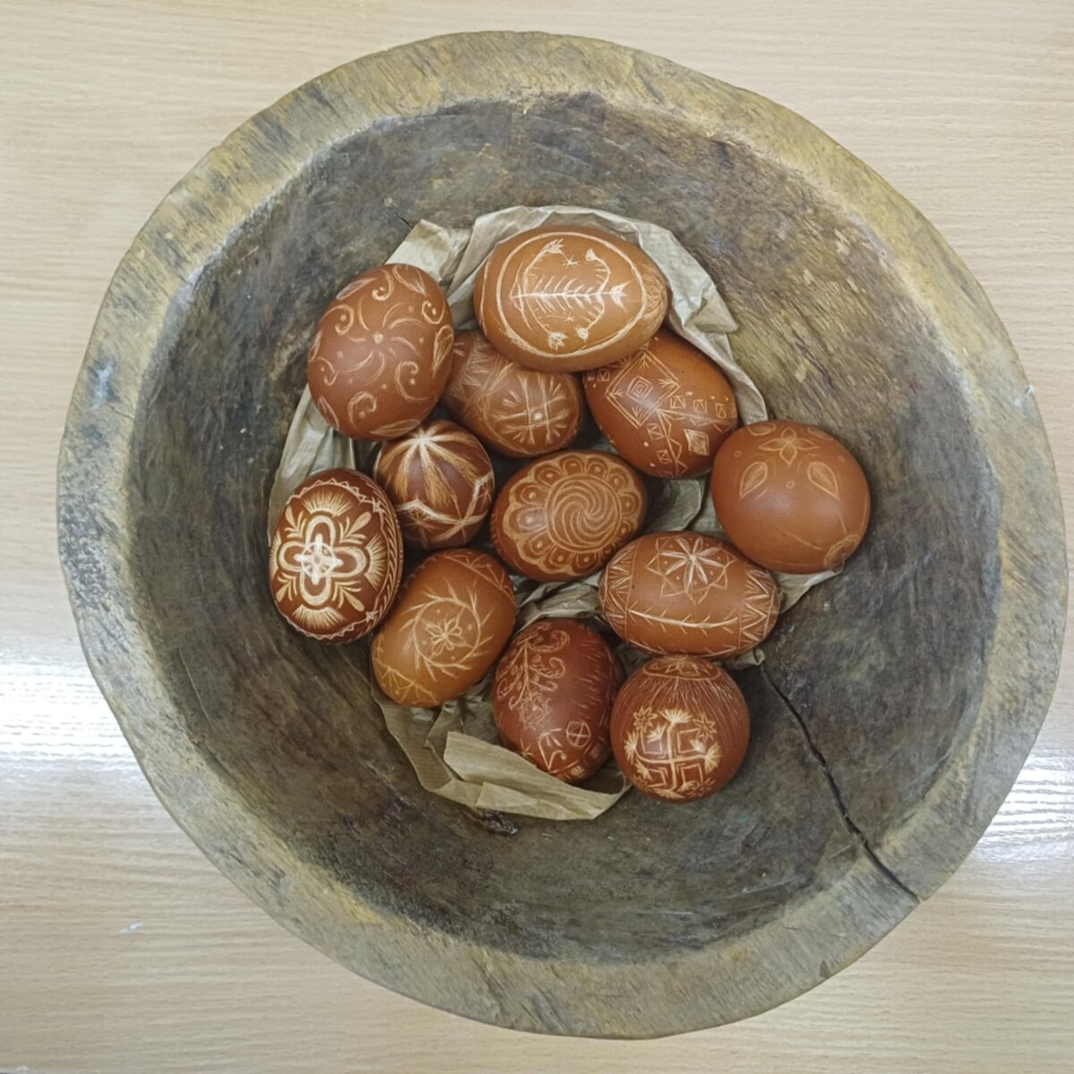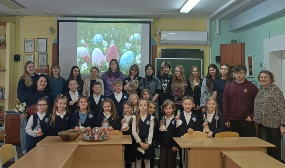 Kol pirmokai pramogavo, jų mokytoja Skirmantė mokė gimnazijos trečiokus margučių skutinėjimo technikos.