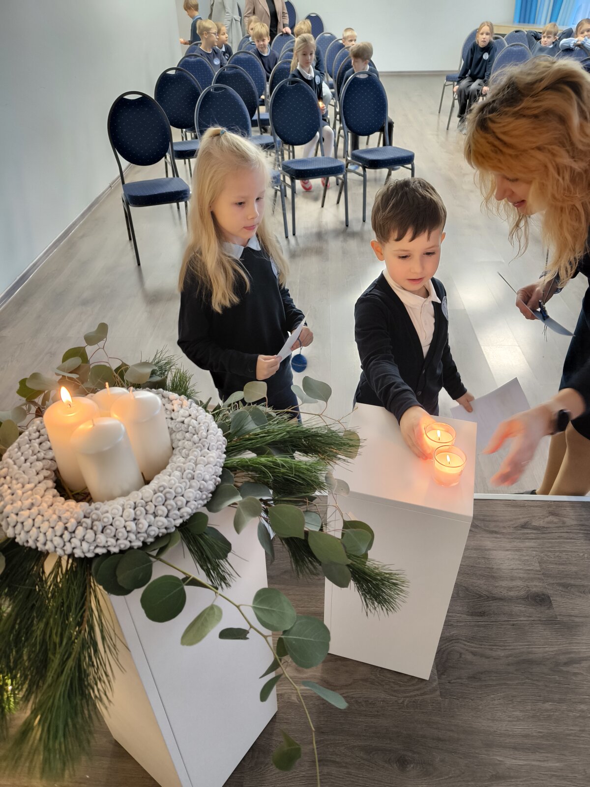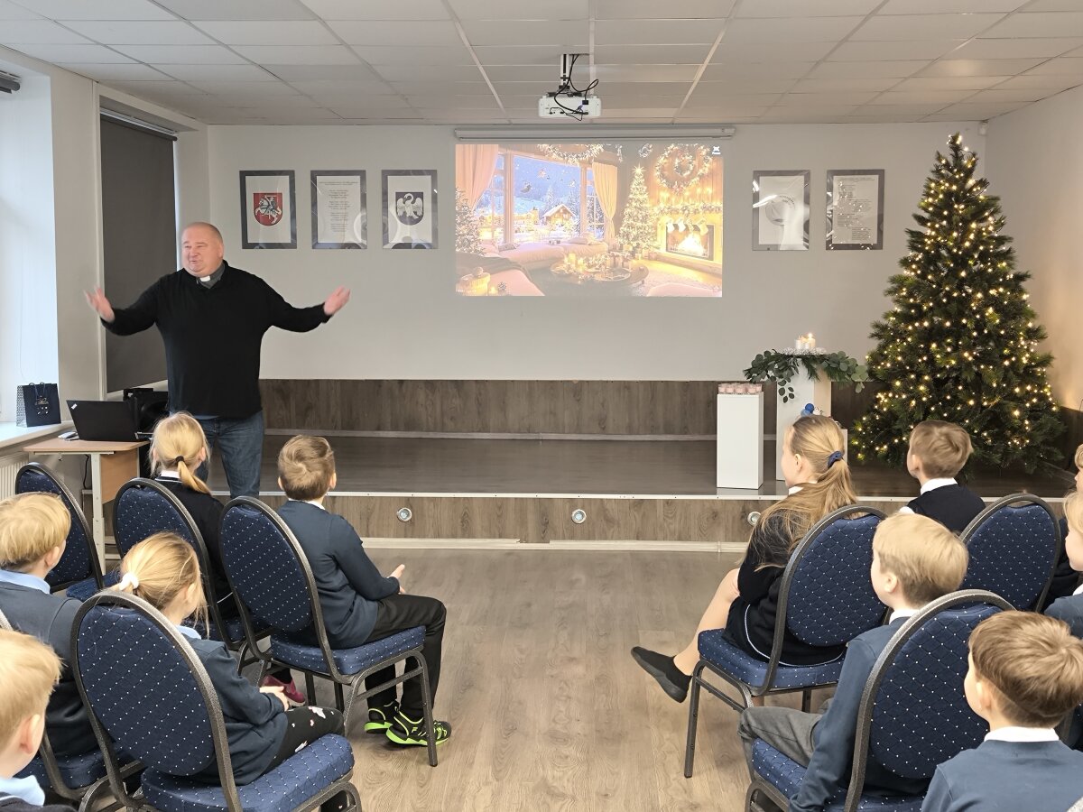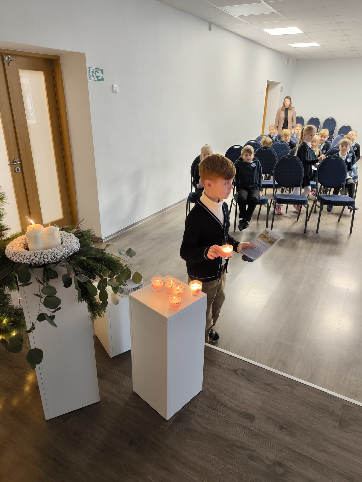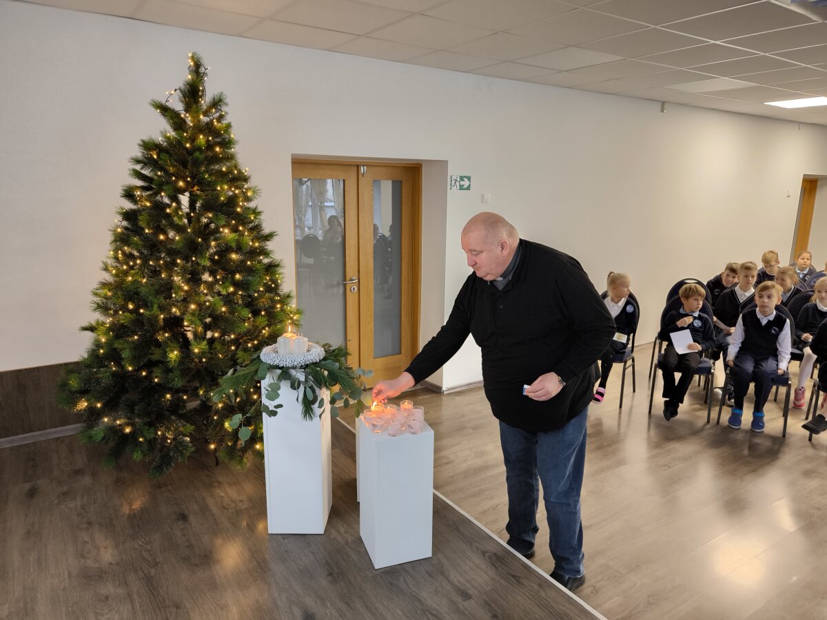 Gruodžio 1-osios rytmetį mokykloje minėjome Advento pradžią. Klebonas Virginijus Birjotas uždegė pirmąją Advento žvakę, simbolizuojančią viltį, ramybę ir šviesą, pasidalijo mintimis apie Advento prasmę ir pakvietė mokyklos bendruomenę atsigręžti į gerumą kasdienybėje. Renginio metu pasveikinome tolerantiškiausius mokinius – tuos, kurie kasdien savo elgesiu kuria draugišką ir šviesią grupės, klasės, mokyklos atmosferą. Ketvirtokas Joris pasakojimu „Pietūs su Dievu“ priminė apie paprastą, bet labai svarbų žmogiškąjį gerumą. Vėliau klebonas kartu su klasių atstovais uždegė žvakeles nuo adventinio vainiko, kad ši, į klases parsinešta šviesa, lydėtų viso laukimo metu, sujungtų mus gerumo tiltais: nuo širdies iki širdies.