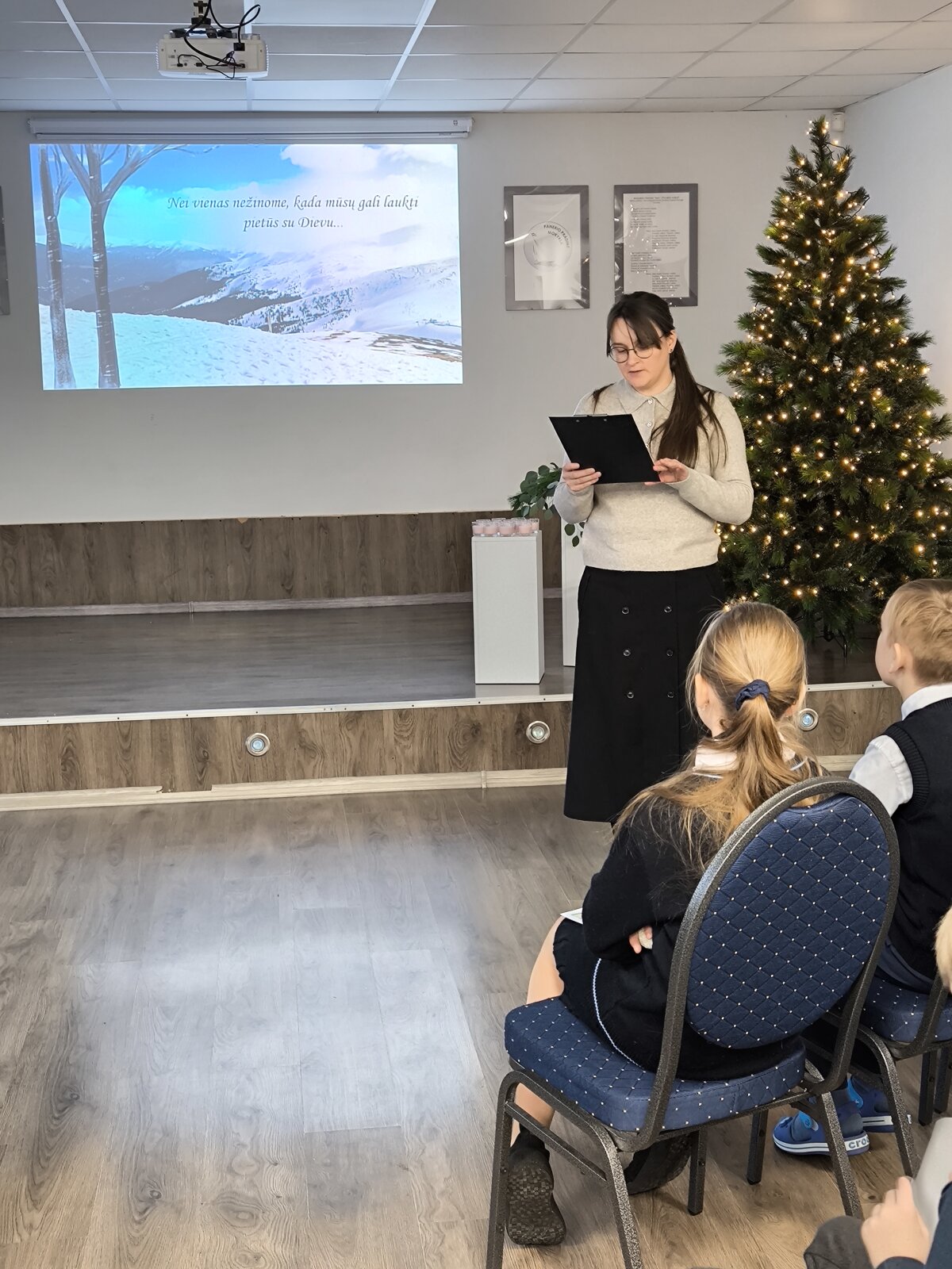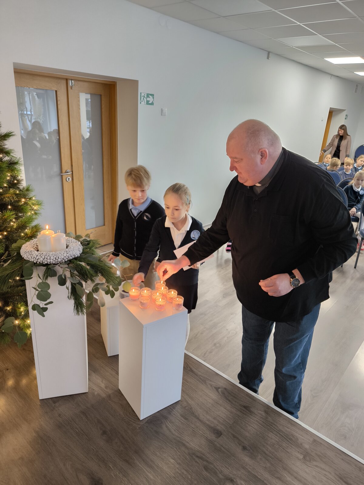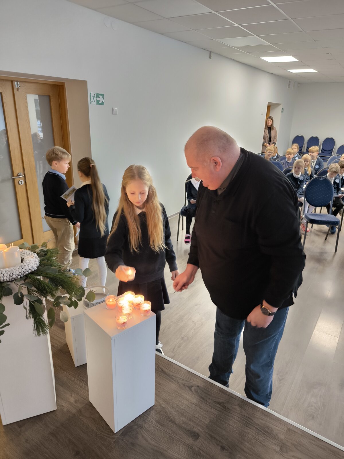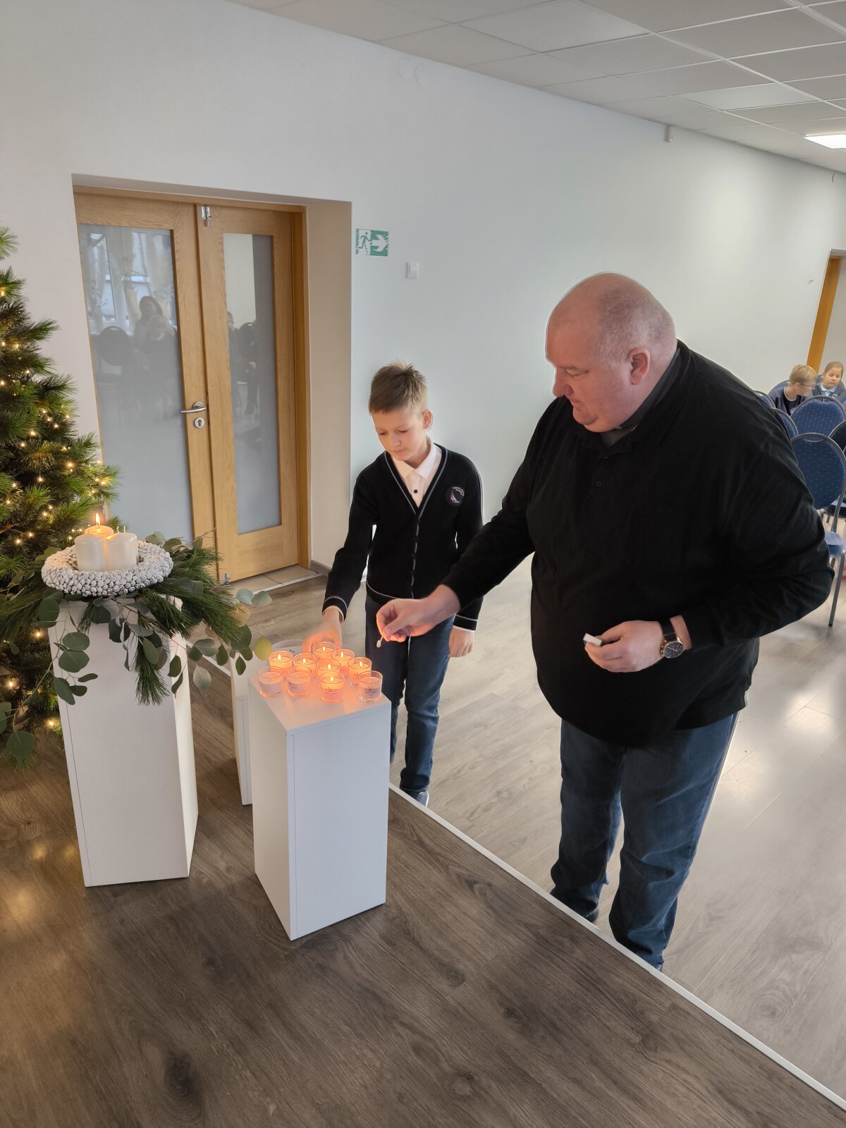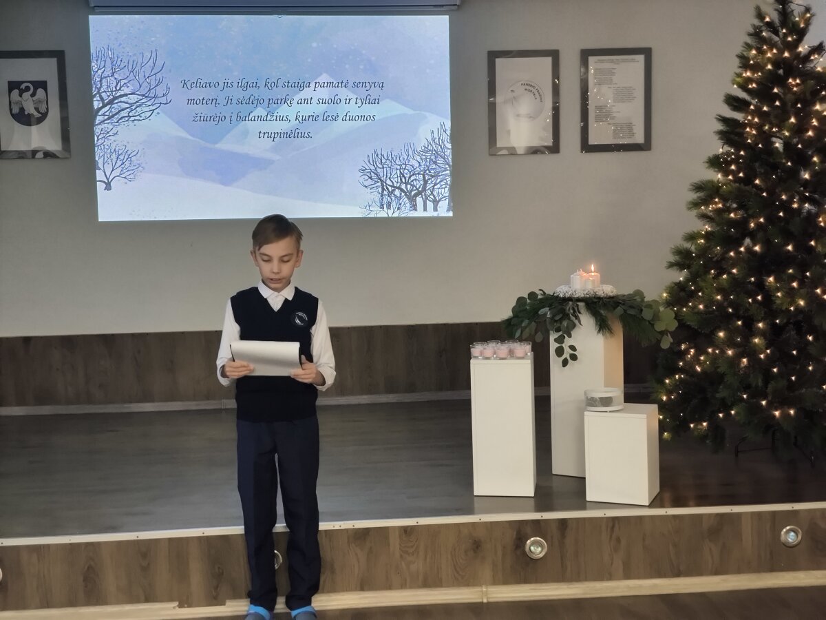 Gruodžio 1-osios rytmetį mokykloje minėjome Advento pradžią. Klebonas Virginijus Birjotas uždegė pirmąją Advento žvakę, simbolizuojančią viltį, ramybę ir šviesą, pasidalijo mintimis apie Advento prasmę ir pakvietė mokyklos bendruomenę atsigręžti į gerumą kasdienybėje. Renginio metu pasveikinome tolerantiškiausius mokinius – tuos, kurie kasdien savo elgesiu kuria draugišką ir šviesią grupės, klasės, mokyklos atmosferą. Ketvirtokas Joris pasakojimu „Pietūs su Dievu“ priminė apie paprastą, bet labai svarbų žmogiškąjį gerumą. Vėliau klebonas kartu su klasių atstovais uždegė žvakeles nuo adventinio vainiko, kad ši, į klases parsinešta šviesa, lydėtų viso laukimo metu, sujungtų mus gerumo tiltais: nuo širdies iki širdies.