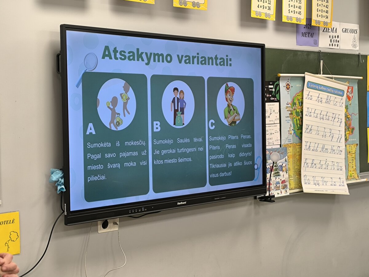 Pamokos metu antrokai sužinojo, kad mokesčiai padeda Lietuvai augti: už juos mokyklose atsiranda vadovėliai, statomi keliai, dirba gydytojai, policininkai ir mokytojai. VMI atstovė pateikė daug linksmų ir suprantamų pavyzdžių, kad vaikai lengviau įsivaizduotų, kas yra mokesčiai.