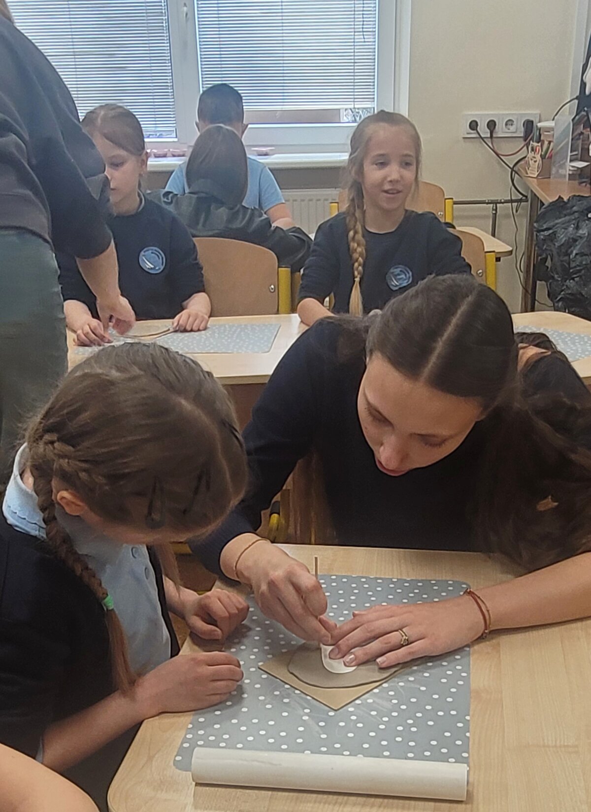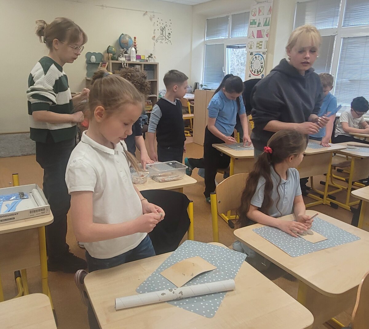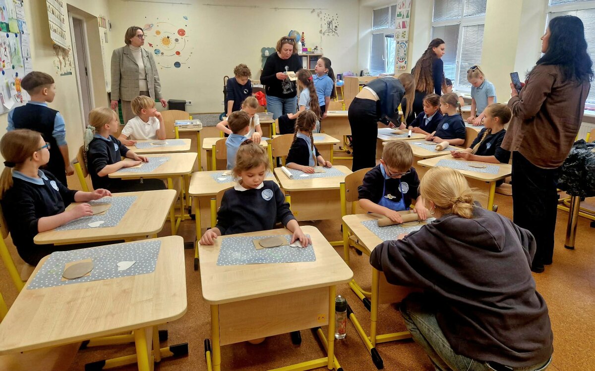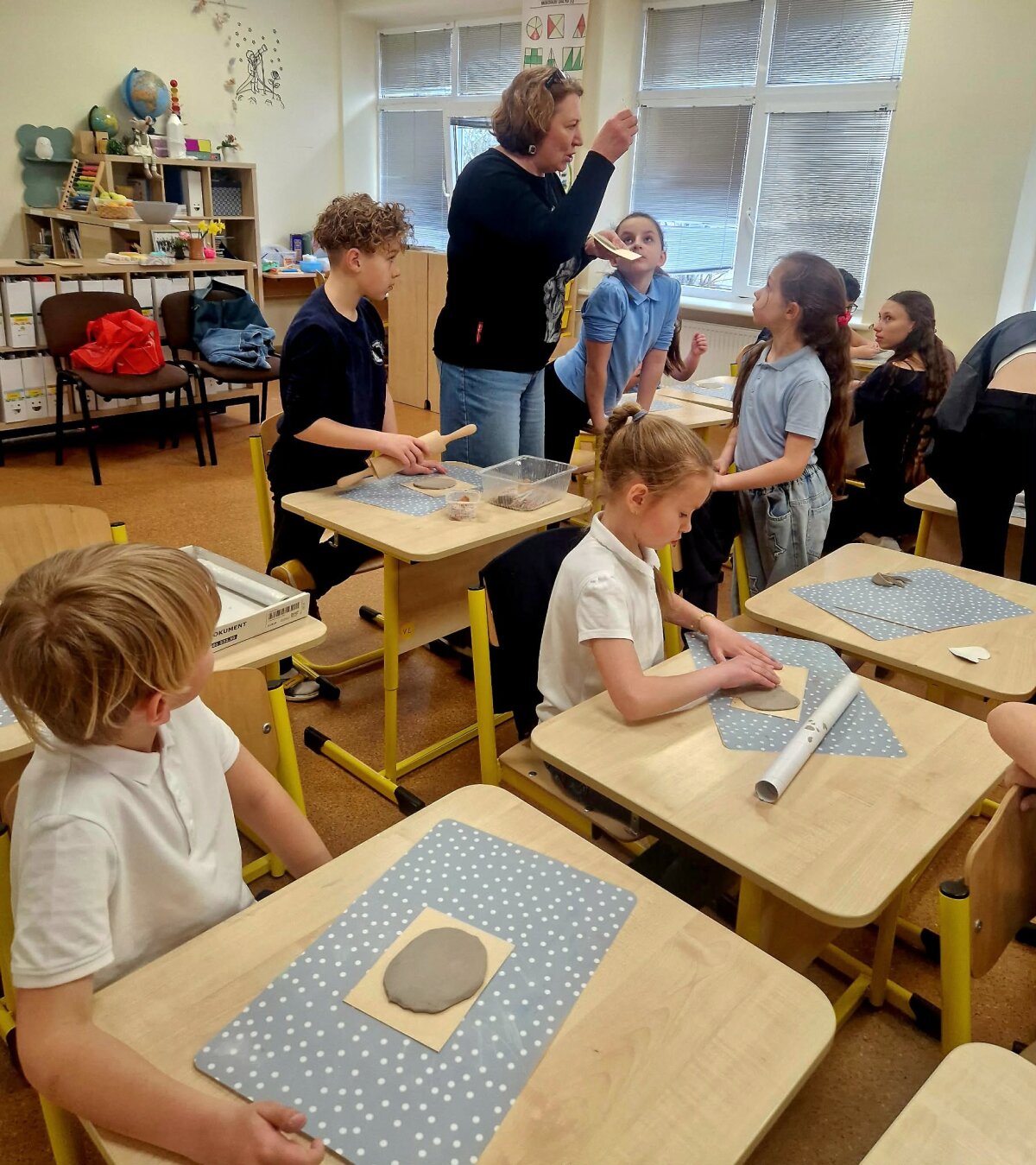 VDM klasė tęsia draugystę su Jonavos Senamiesčio gimnazijos mokytojomis Edita, Jolanta bei gimnazistais. Šį kartą svečiai pirmokus supažindino su molio rūšimis, paaiškino, kaip gimsta keramikos dirbiniai. Vaikai minkė baltąjį molį, iškočiojo, išsipjovė gaminio formą, įspaudais dekoravo savo gaminius. Pagaminti molinukai iškeliavo į gimnaziją. Ten bus padengti glazūra ir išdegti.