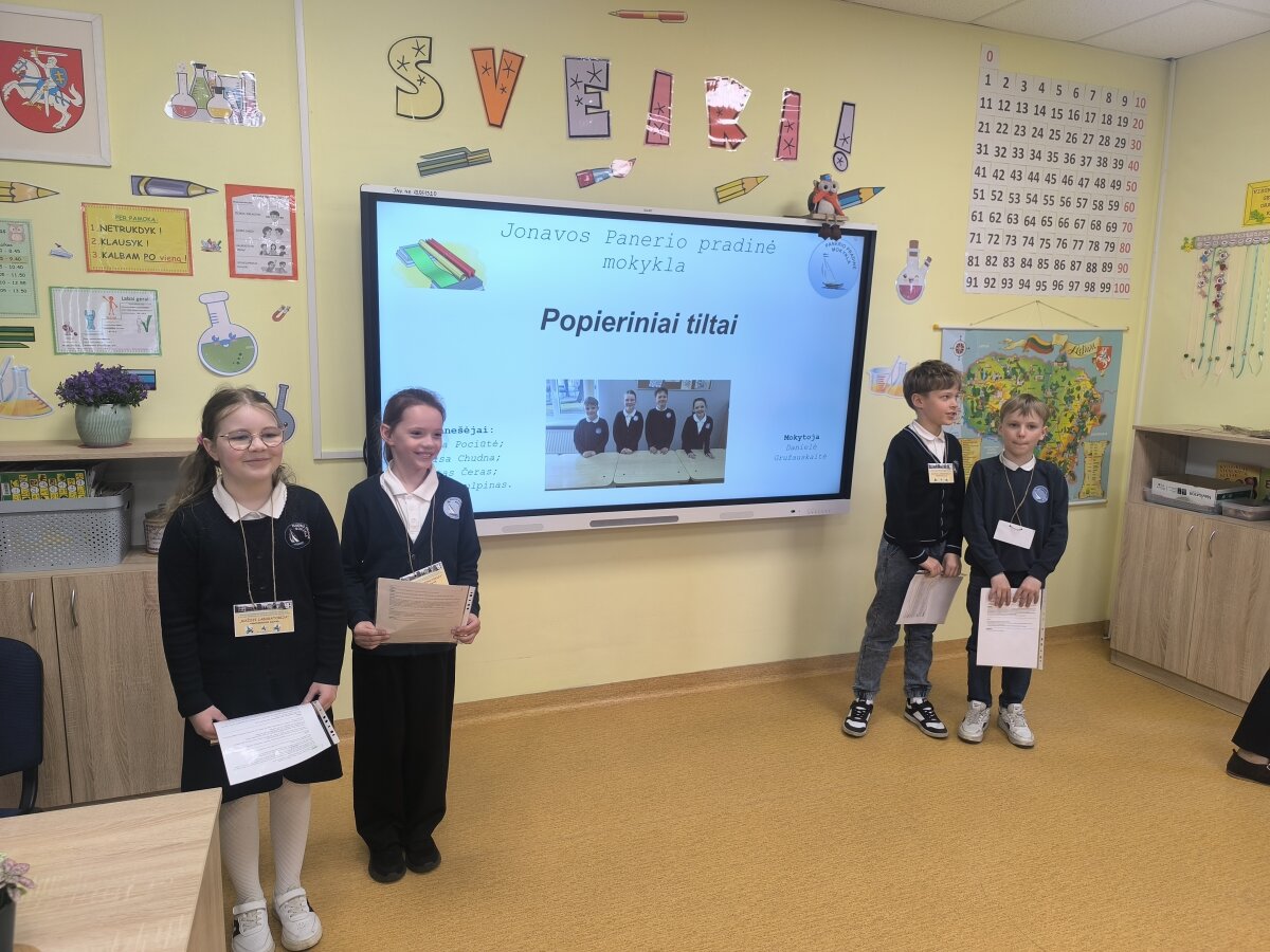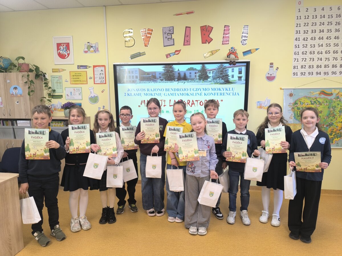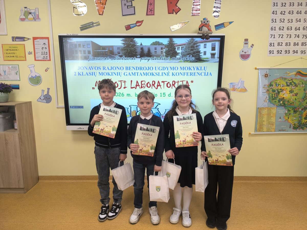 2b klasės mokiniai Alisa, Elisa, Matas ir Herkus kartu su mokytoja Daniele dalyvavo Jonavos rajono bendrojo ugdymo mokyklų 2 klasių mokinių gamtamokslinėje konferencijoje „Mažoji laboratorija“. Joje mokiniai skaitė pranešimą apie atliktą eksperimentą „Popieriniai tiltai“. Pristatymo metu jie pasakojo, kaip kūrė popierinius tiltus ir tikrino jų tvirtumą. Konferencijos pabaigoje mokiniai turėjo galimybę išbandyti elektros grandines. Dalyvavimas konferencijoje mokiniams suteikė naujų žinių, patirties ir gerų emocijų.