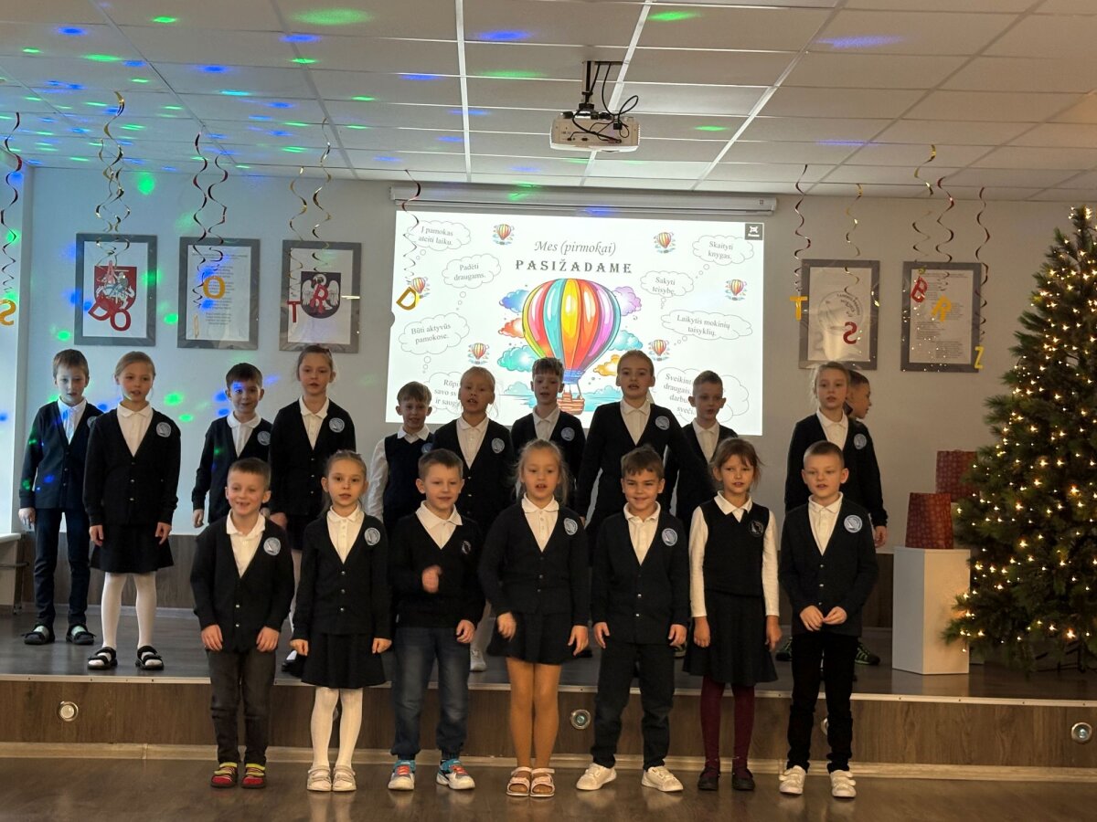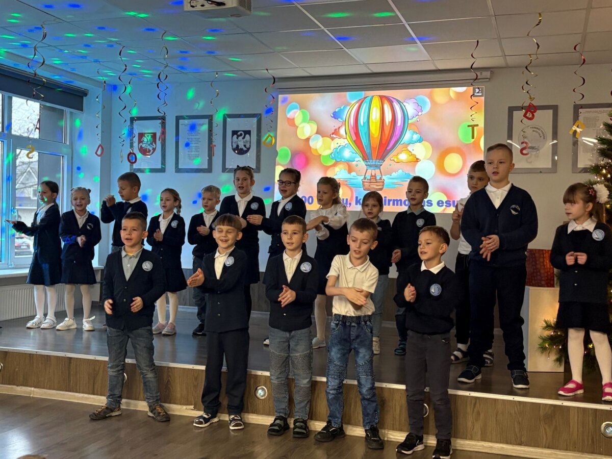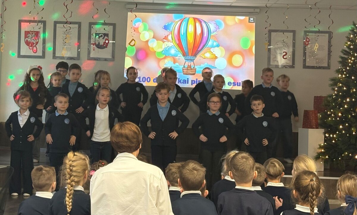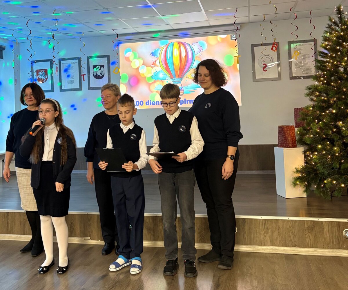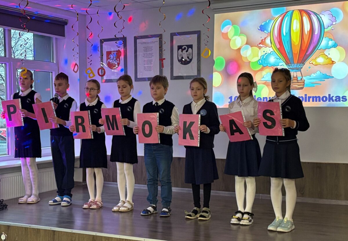 Tokiais žodžiais ketvirtokai pradėjo šventę "Jau 100 dienų, kai pirmokas esu". Padrąsinimo žodį, prieš kelionę po žinių ir išminties padangę, tarė mokyklos direktorė I. Karnusevičienė ir pavaduotoja ugdymui D. Bisigirskienė. Pirmiausia laukė kelionė į Lietuvių kalbos šalį. Pirmokai sėkmingai atliko užduotis, nes įrodė, kad skaityti jau moka! Matematikos šalyje pirmokai sprendė linksmus uždavinukus. Draugiškai suskaičiavo žuvis, gėles ir kiškučius. Pasaulio pažinimo šalyje kiekviena pirmokų klasė gavo po voką. Jame susimaišę lapeliai su tais žmonėmis, kurie veda mokslo labirintais. Teisingai suklijavę lapelius pirmokai puikiai įvardijo profesijas ir žmones, kurie dirba mokykloje. Ketvirtokai gėrėjosi ir plojo pirmokams už gražias dainas ir šokį. Šventės pabaigoje pirmokai pasižadėjo laikytis klasės ir mokyklos taisyklių, o ketvirtokai, linkėdami sėkmingo skrydžio mokslo kelyje, įteikė maišelius su dovanomis.