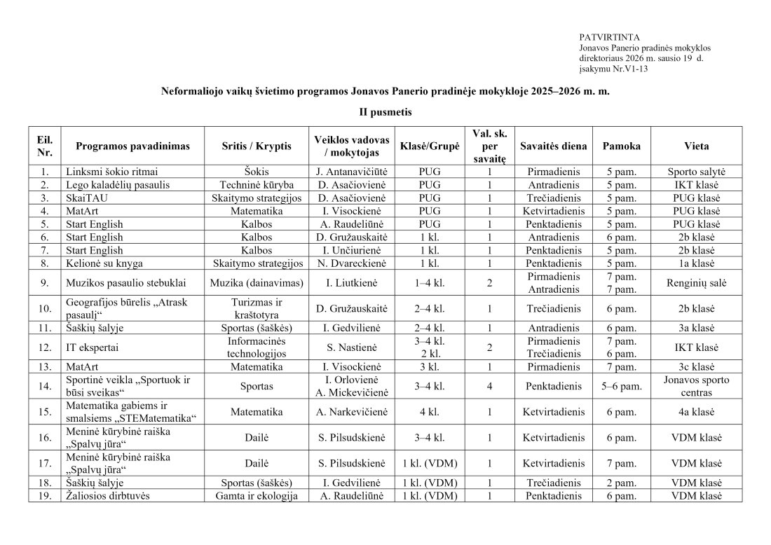 2025-2026 m. m. neformaliojo vaikų švietimo tvarkaraštis